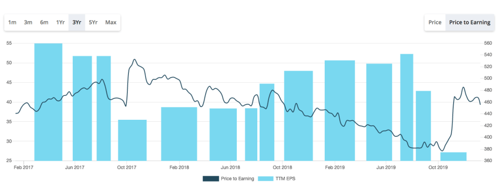 There was a high of 80 pe in 2015, it has come down steadily except recently where the pe has jumped, most likely due to the drop in profits. The price in 2015 was about 25k , now around 15k.